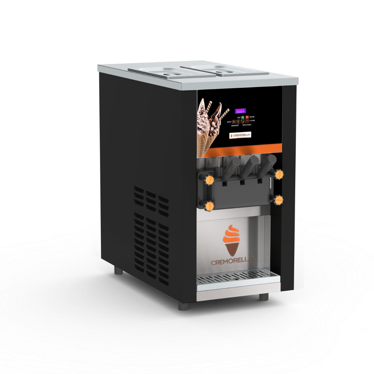 The Cremorella MSC200B Single-Phase Soft Serve & Açaí Machine is a high-performance professional equipment designed for ice cream shops, snack bars, bakeries, and cafés. With the capacity to produce up to 200 cones per hour, it features two 7.5-liter storage tanks and two independent 1.8-liter freezing cylinders, ensuring continuous production of soft ice cream and açaí bowls.Equipped with a self-returning motorized lever, digital control system, and optional air pump for product incorporation, the MSC200B delivers excellent texture, efficiency, and consistency. Its stainless steel construction guarantees durability and ease of cleaning.