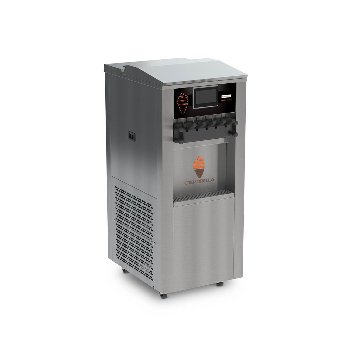 The Cremorella MSC600 is a high-capacity soft serve ice cream and açaí machine designed for demanding operations. It produces up to 600 cones per hour and can serve up to 5 flavors, with 3 individual flavors and 2 mix combinations. Equipped with three 3.17-gallon (12 L) hoppers and three 0.47-gallon (1.8 L) cylinders, it ensures efficient refrigeration with independent motors for each cylinder. Operation is managed through a digital touchscreen, allowing different consistencies for ice cream, açaí, or yogurt. The MSC600 also includes low-mix sensors, individual gearboxes, and advanced cooling control. Built with a vertical stainless-steel design, it is ideal for ice cream parlors, bakeries, restaurants, and high-demand businesses.