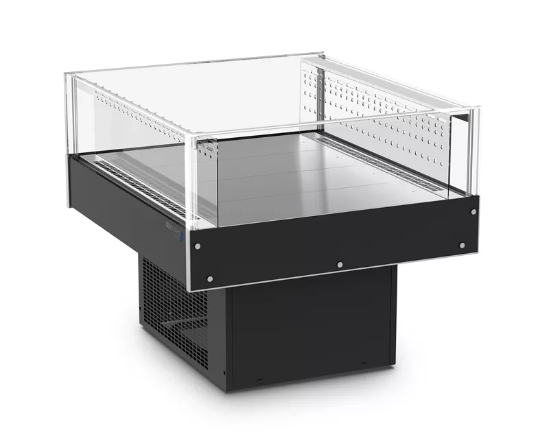 Premium horizontal refrigerated display case with tempered glass front and side panels, forced-air cooling system with eco-friendly R290 refrigerant, and digital temperature controller. Features stainless steel (304/430) bottom trays, transparent polycarbonate air outlet, Draim Free system, and exterior in painted galvanized steel. Supplied with built-in condensing unit.