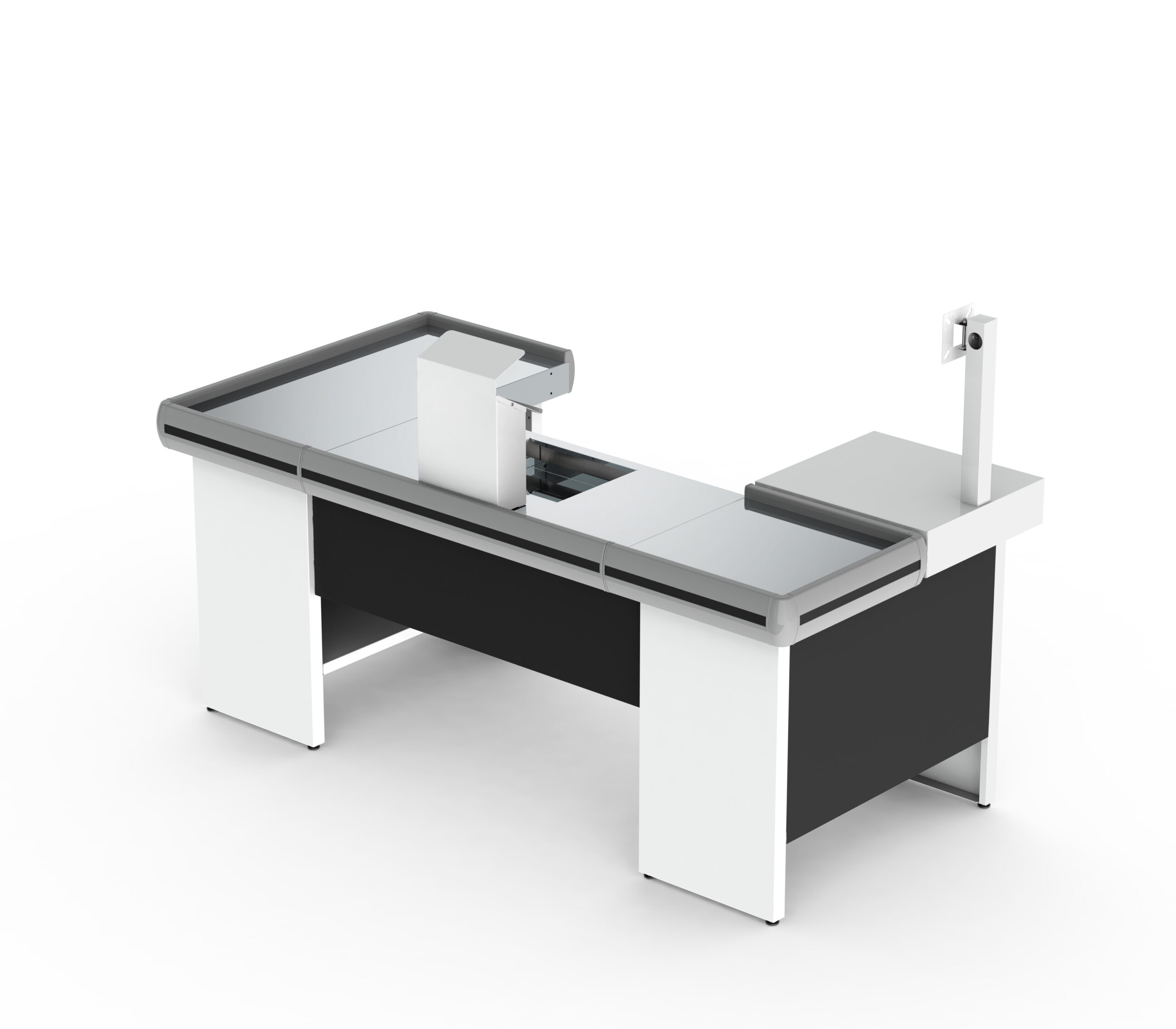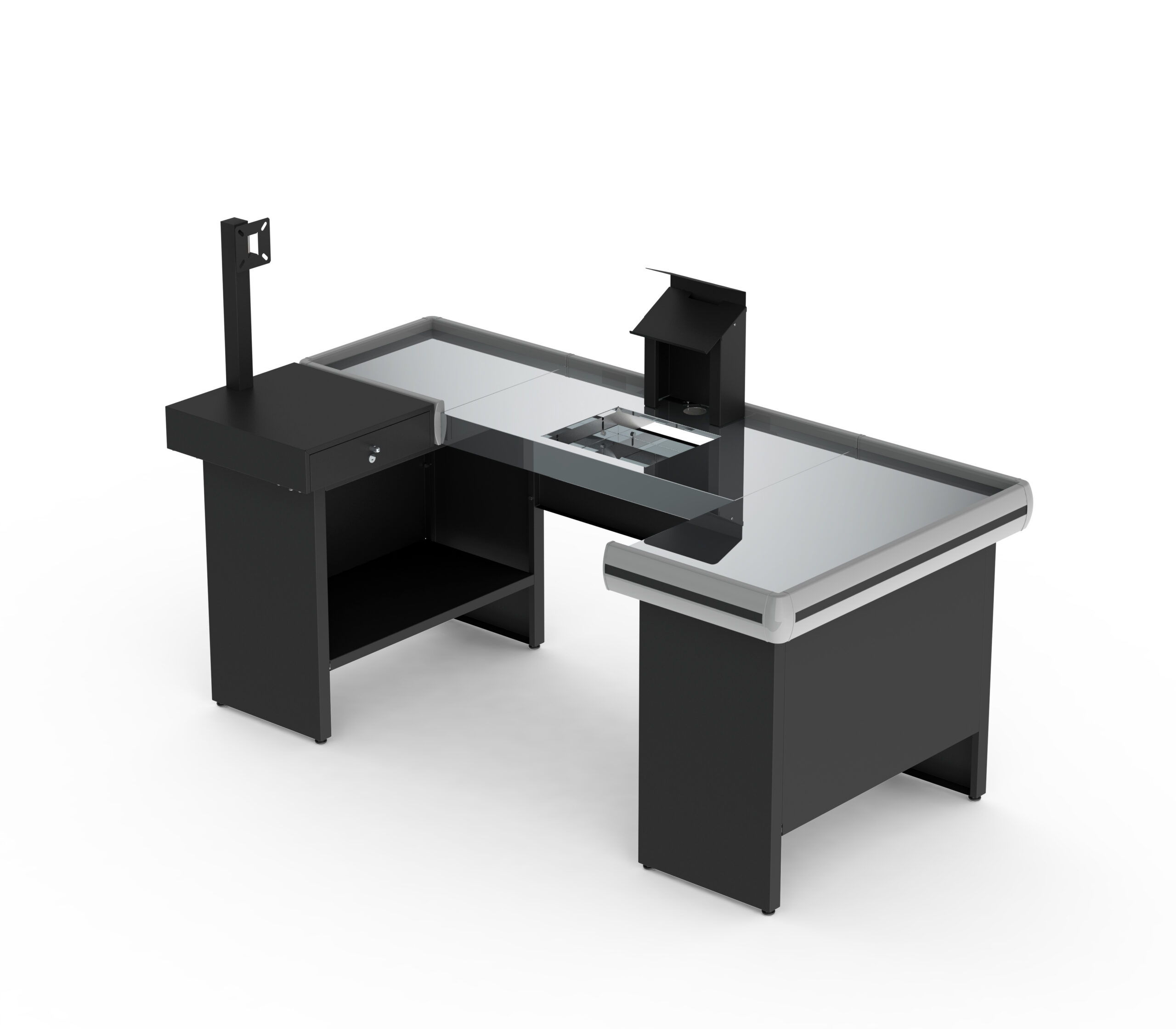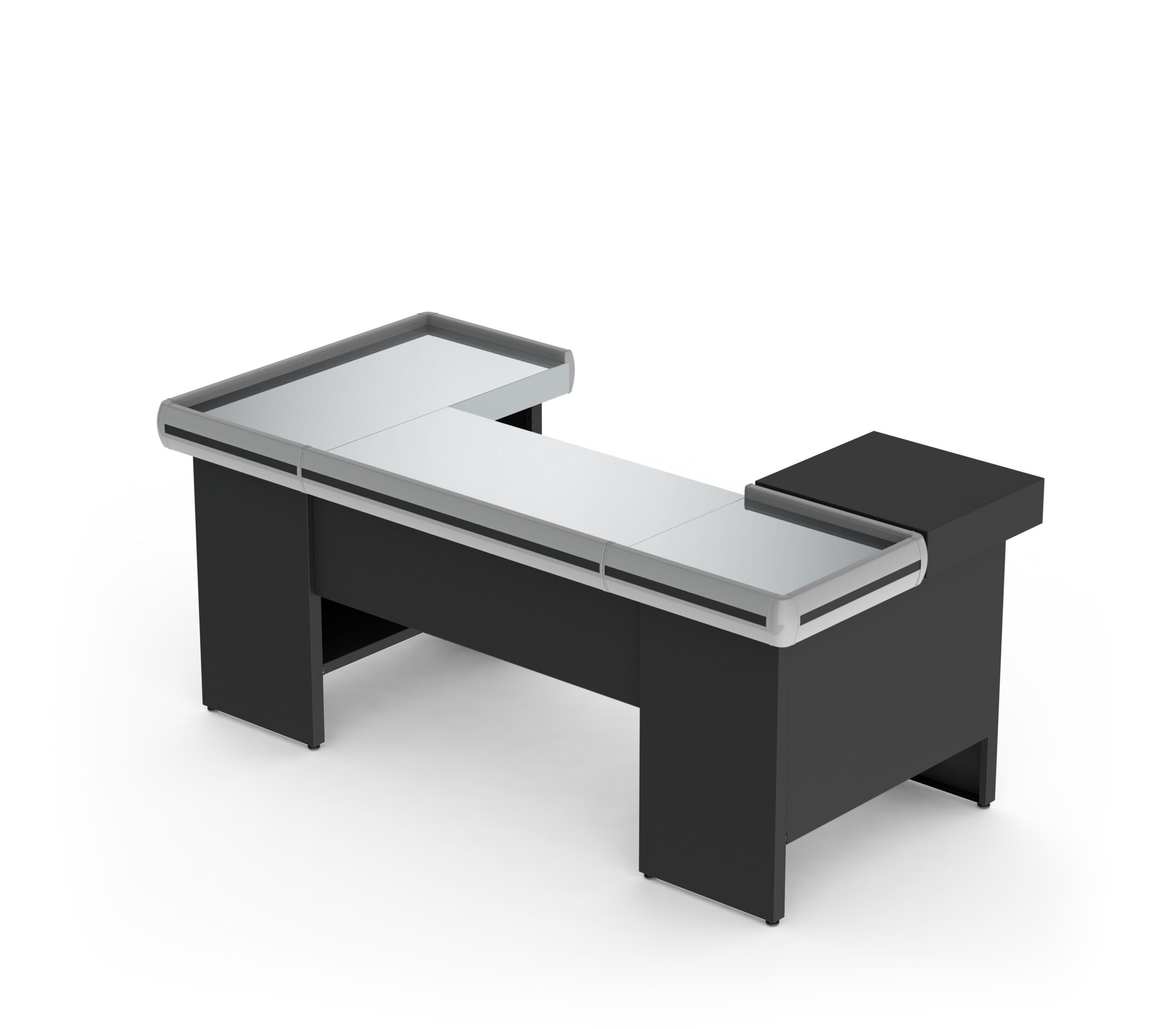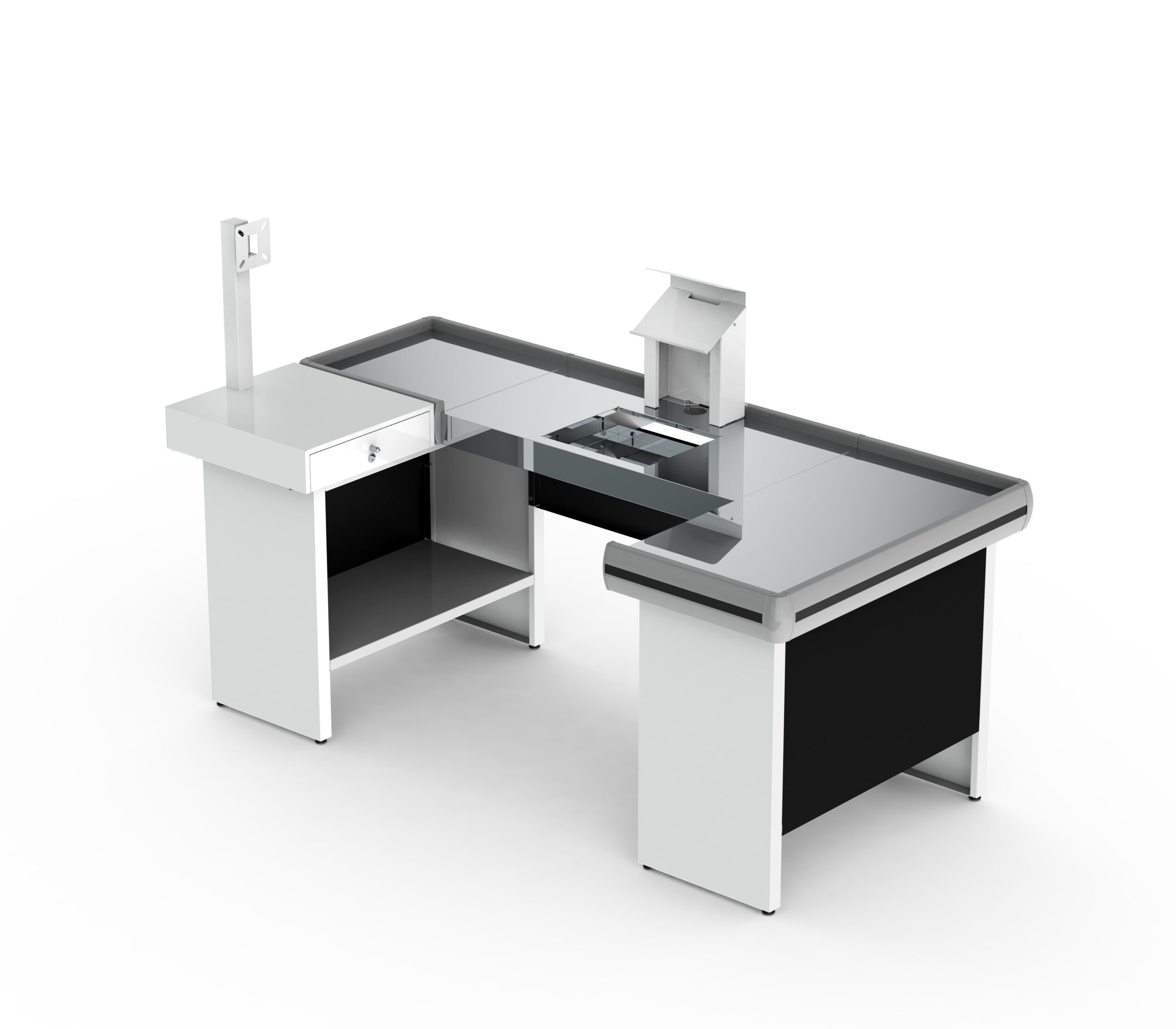 The Premium Checkout Counter 2000 is designed for supermarkets and retail stores that need durability, functionality, and a professional finish. Built with a galvanized steel structure (painted black, with optional black or white finish), it features a polished stainless steel top, PVC bumper profile, and a lockable galvanized steel drawer for secure storage. Adjustable-height legs ensure stability, while its modular design allows assembly on either the right or left side to suit store layouts. Optional accessories include automation kits for monitor and barcode scanner support, cut-out top with scale support, or plain top with cut-out only for scanner installation.
