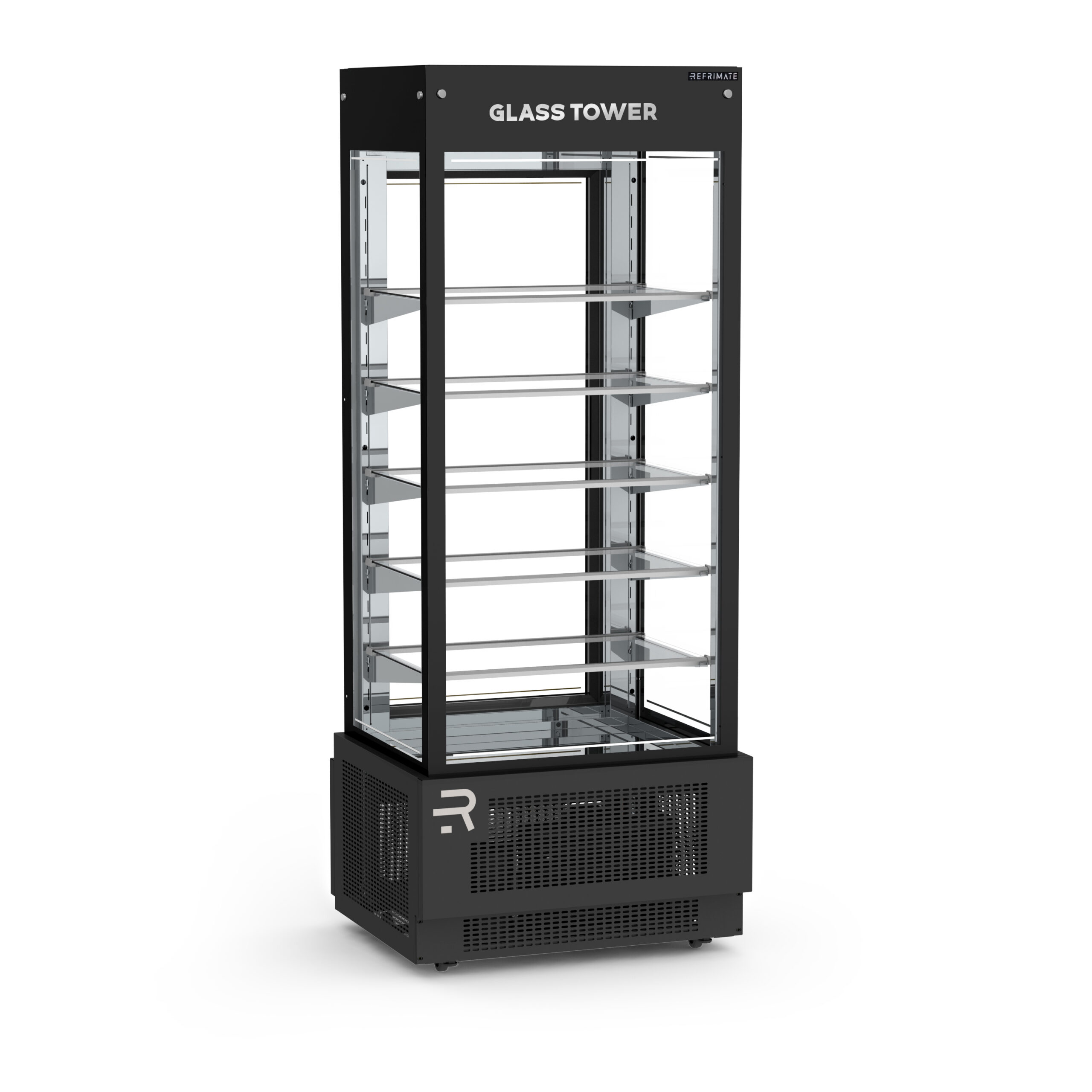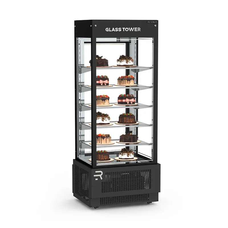 The Refrimate Glass Tower Premium Display (VGTPR) is a vertical refrigerated showcase designed for cakes, pies, and desserts. With a temperature range of 36°F to 43°F and forced-air refrigeration, it keeps products fresh and visually appealing. Built with tempered heated glass, LED lighting (4000K), and five fixed shelves, it provides excellent visibility and a modern presentation. The interior is finished in stainless steel 430, while the exterior is painted galvanized steel, combining durability with style.