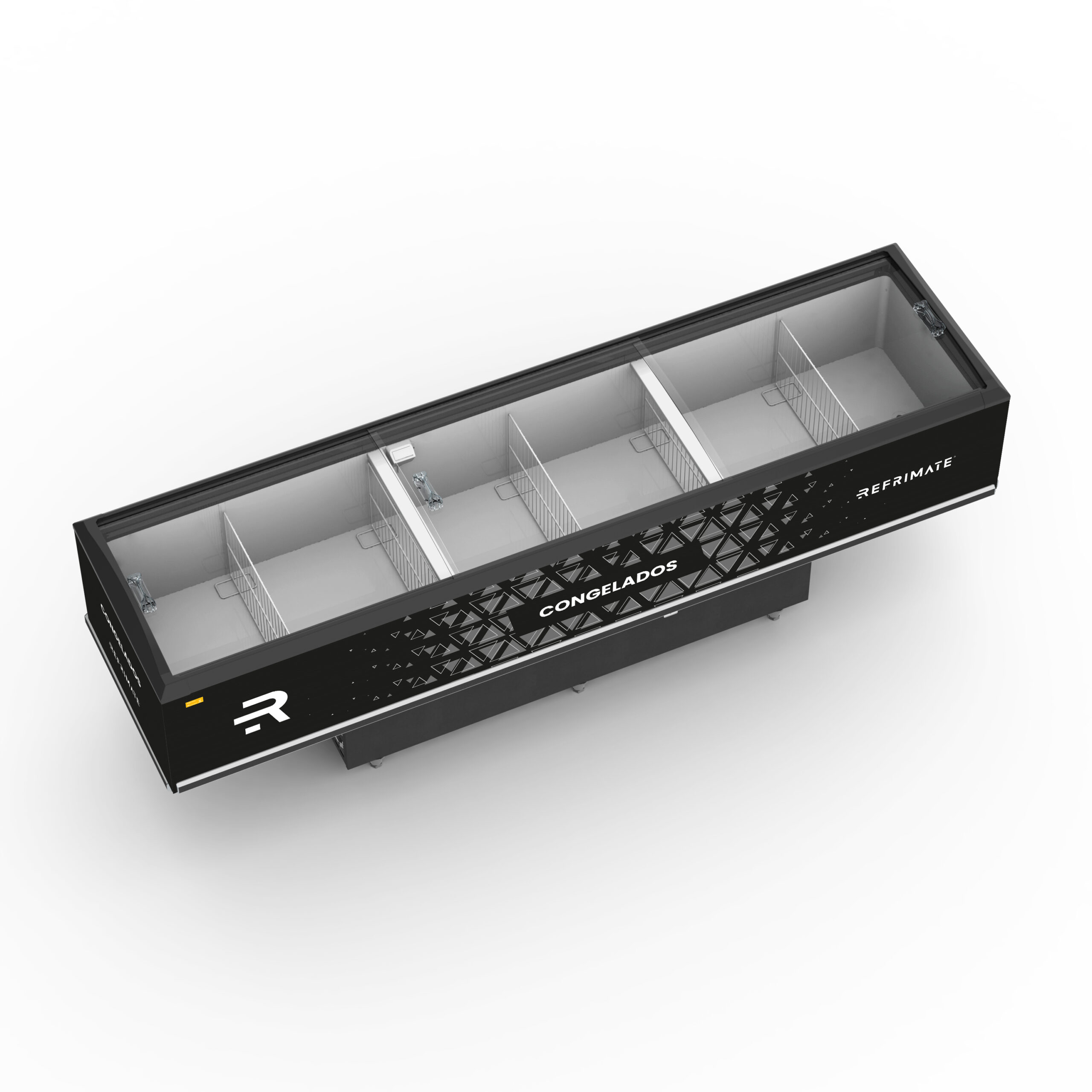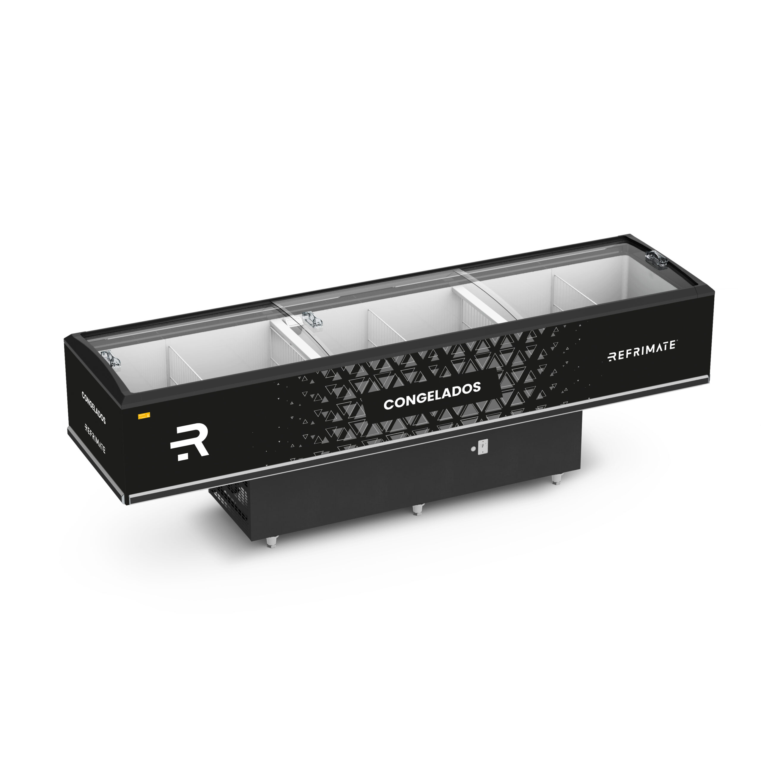 The Refrimate Vanguard Island Display (EIVT line) is designed for supermarkets, minimarkets, and convenience stores, offering models for either frozen or refrigerated products. The freezer versions operate at 0°F, while the refrigerated versions keep products between 32°F and 45°F. Available in two sizes, the units feature static refrigeration, tempered sliding glass lids with low-emissivity treatment, LED lighting, internal dividers, and polyurethane thermal insulation.